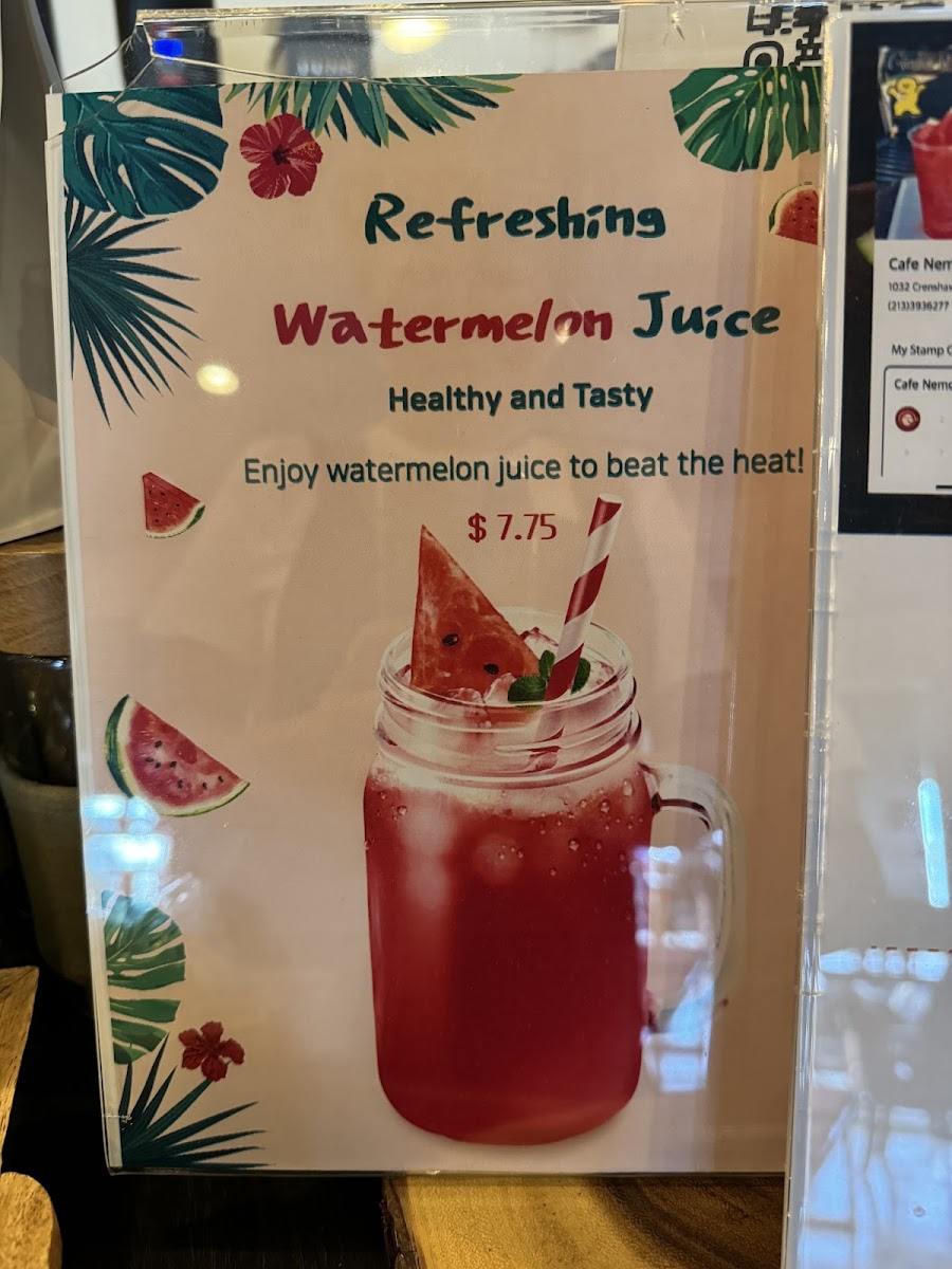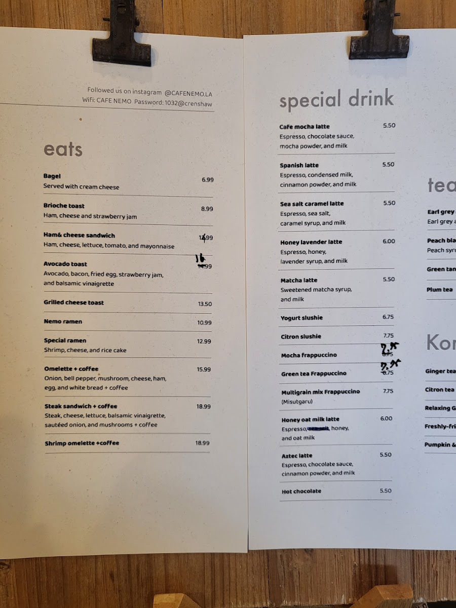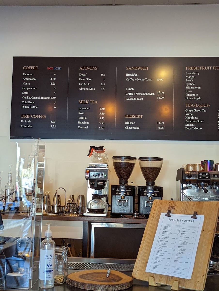 The menu features classic coffee options like drip coffee from Ethiopia or Colombia, alongside specialty lattes such as the unique Nemo Latte and Spanish Latte. Refreshing choices like iced coffee and fresh juices provide a cool balance, perfect for warm Los Angeles days.