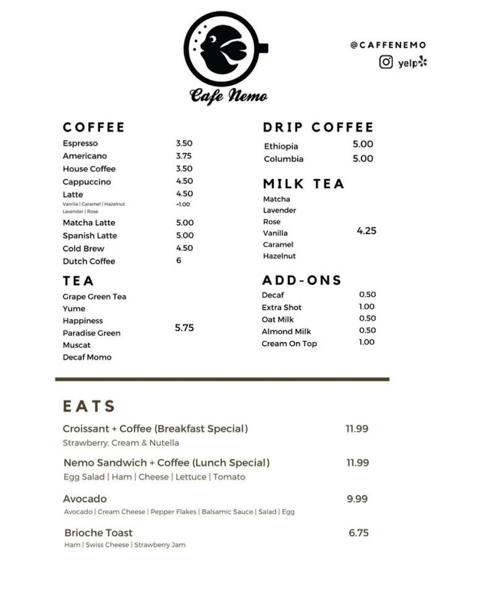 Cafe Nemo offers a straightforward and inviting menu that emphasizes simple café favorites and comforting drinks. Whether you're stopping by for a quiet morning pick-me-up or settling in for a relaxed afternoon, the selection caters to easy moments of enjoyment.